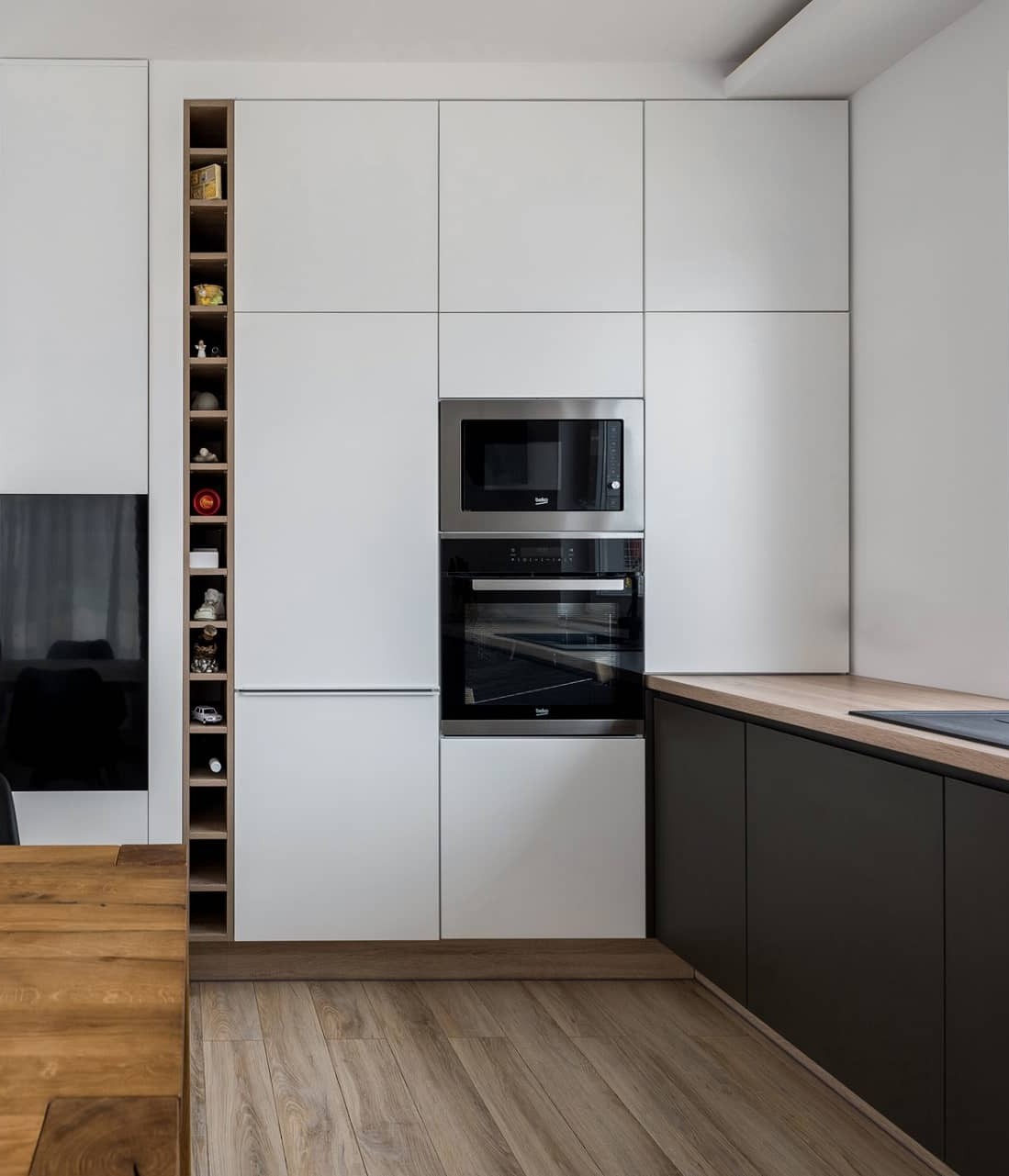 Egy pici konyhában egy magas elem túl robusztusnak tűnhet, és elnyomhatja a teret. Ezért kell tervezni. Egy rosszul elhelyezett torony elvághatja a