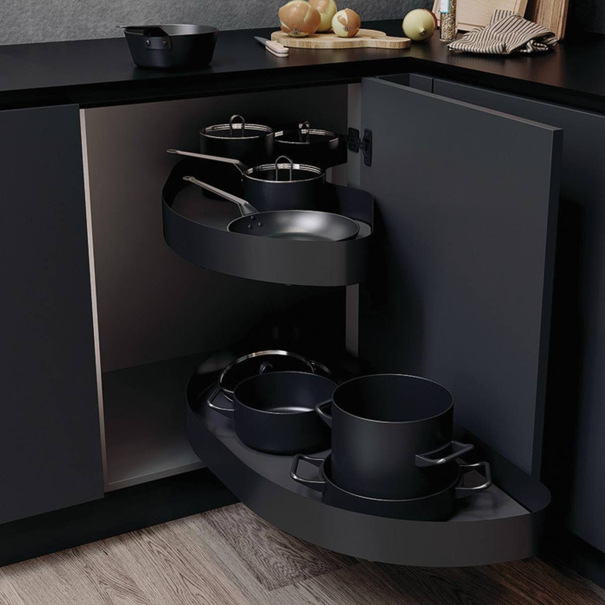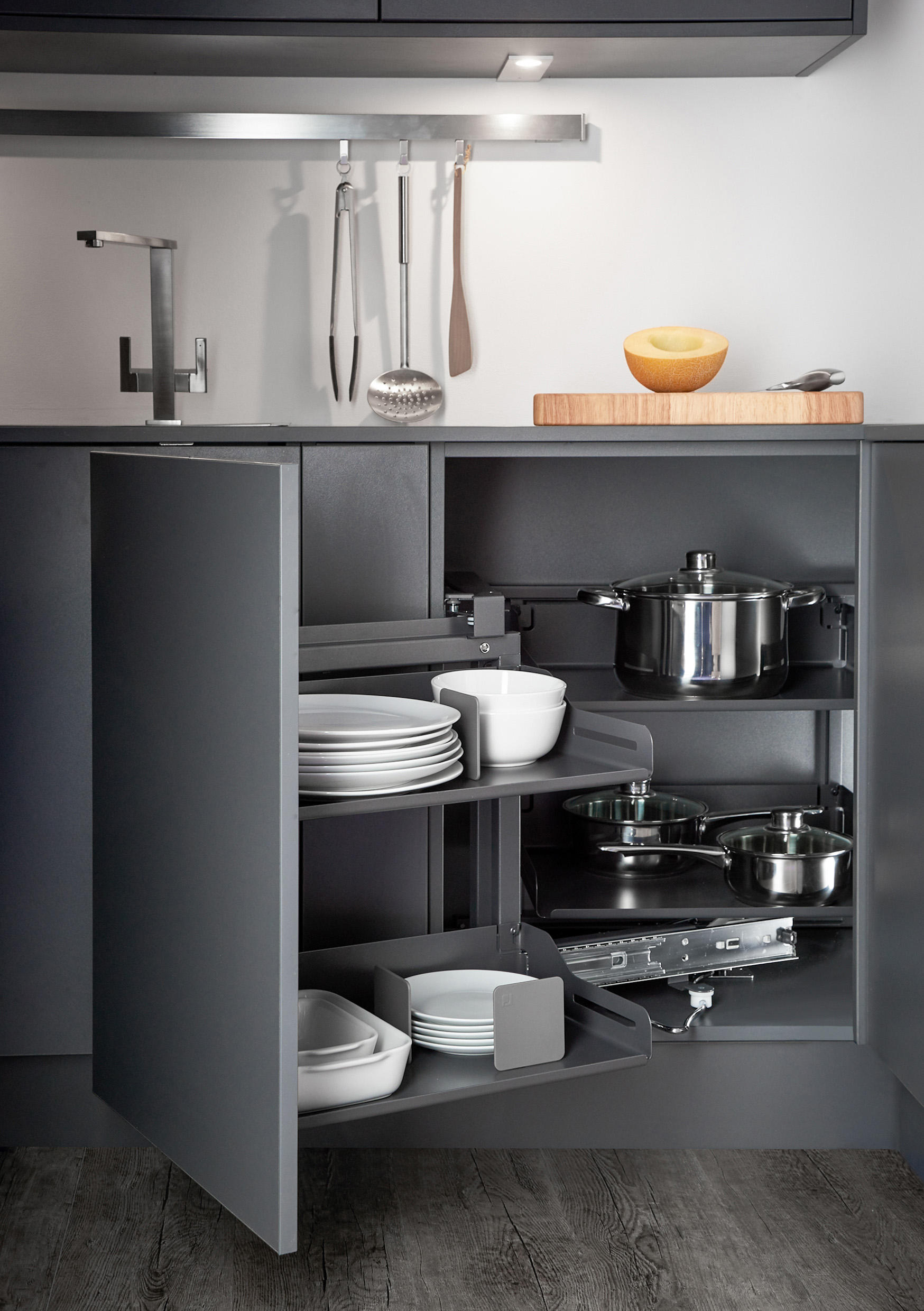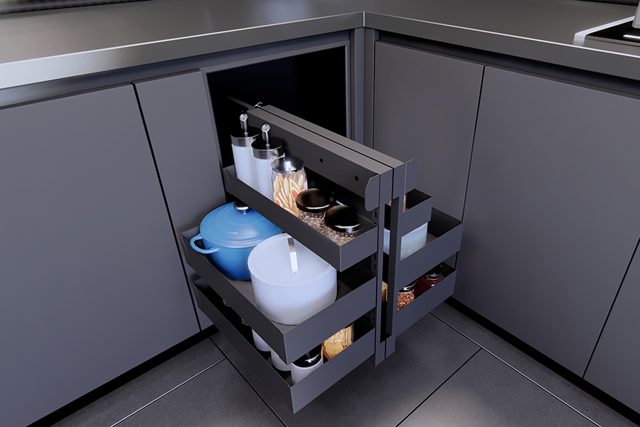 Végül, de nem utolsó sorban a Space Corner, a Blum speciális sarokfiók-megoldása. Ha valaki a fiókok szerelmese – és valljuk be, a teljes kihúzású fióknál nincs kényelmesebb –, akkor ez a megoldás lehetővé teszi, hogy a legmélyebb zugokat is rendszerezetten használjuk.
