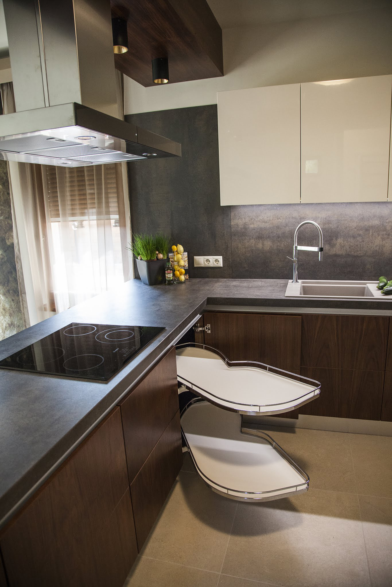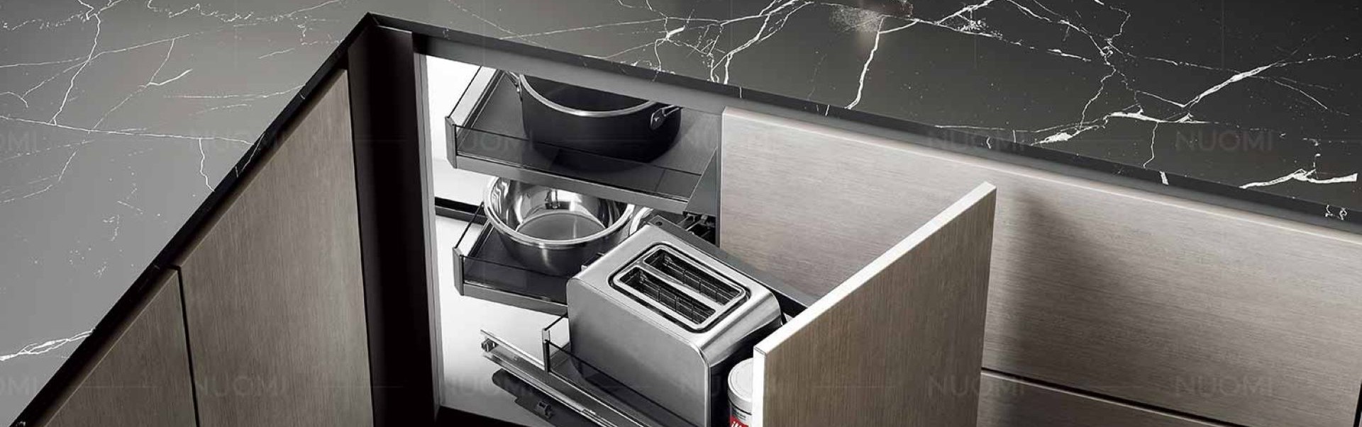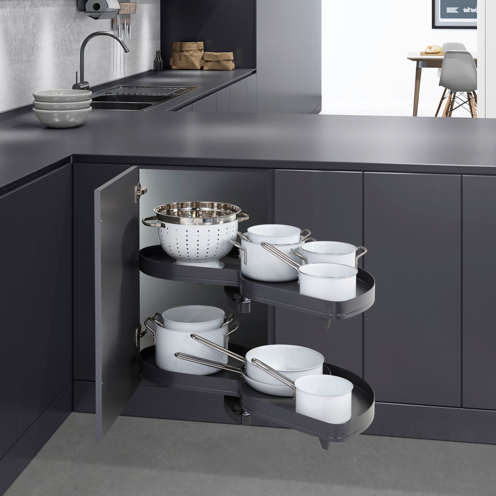 Végül, de nem utolsó sorban a Space Corner, a Blum speciális sarokfiók-megoldása. Ha valaki a fiókok szerelmese – és valljuk be, a teljes kihúzású fióknál nincs kényelmesebb –, akkor ez a megoldás lehetővé teszi, hogy a legmélyebb zugokat is rendszerezetten használjuk.