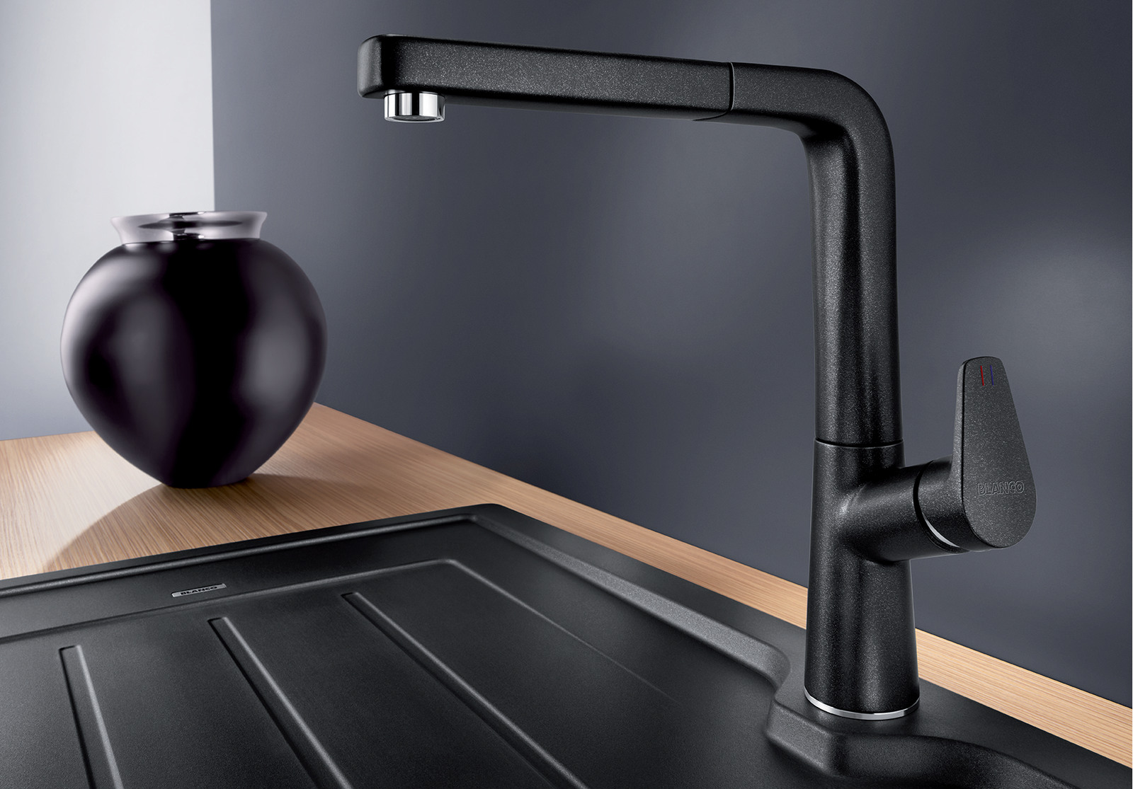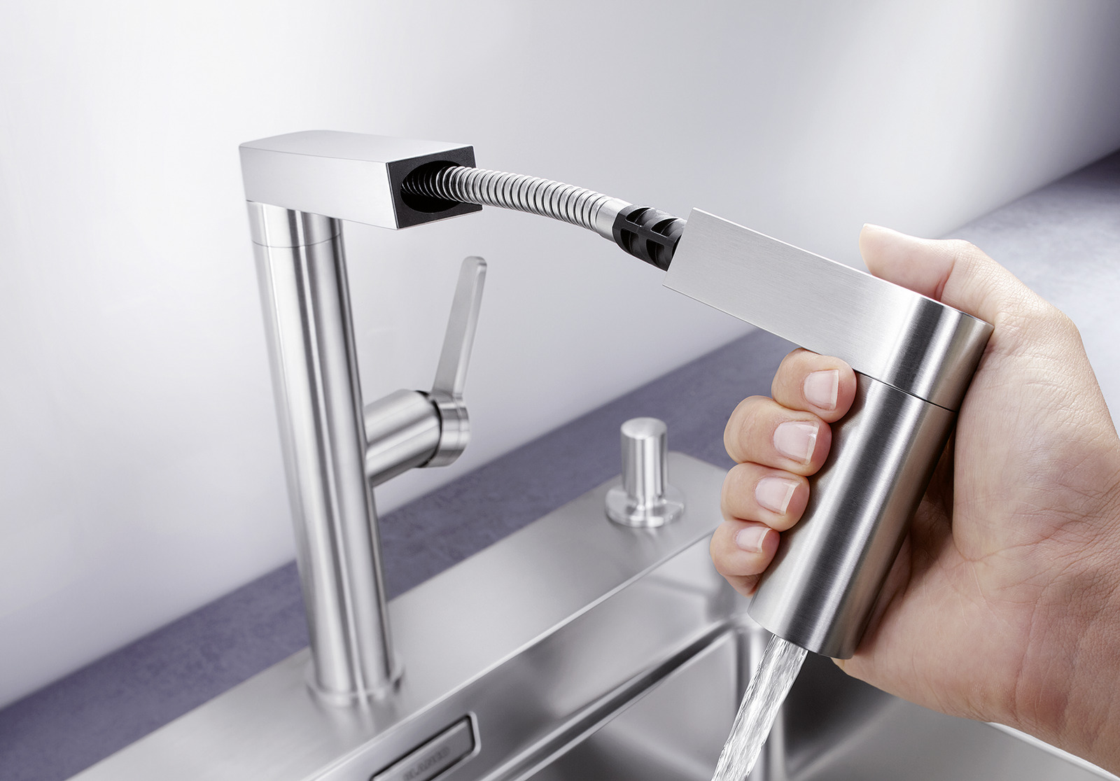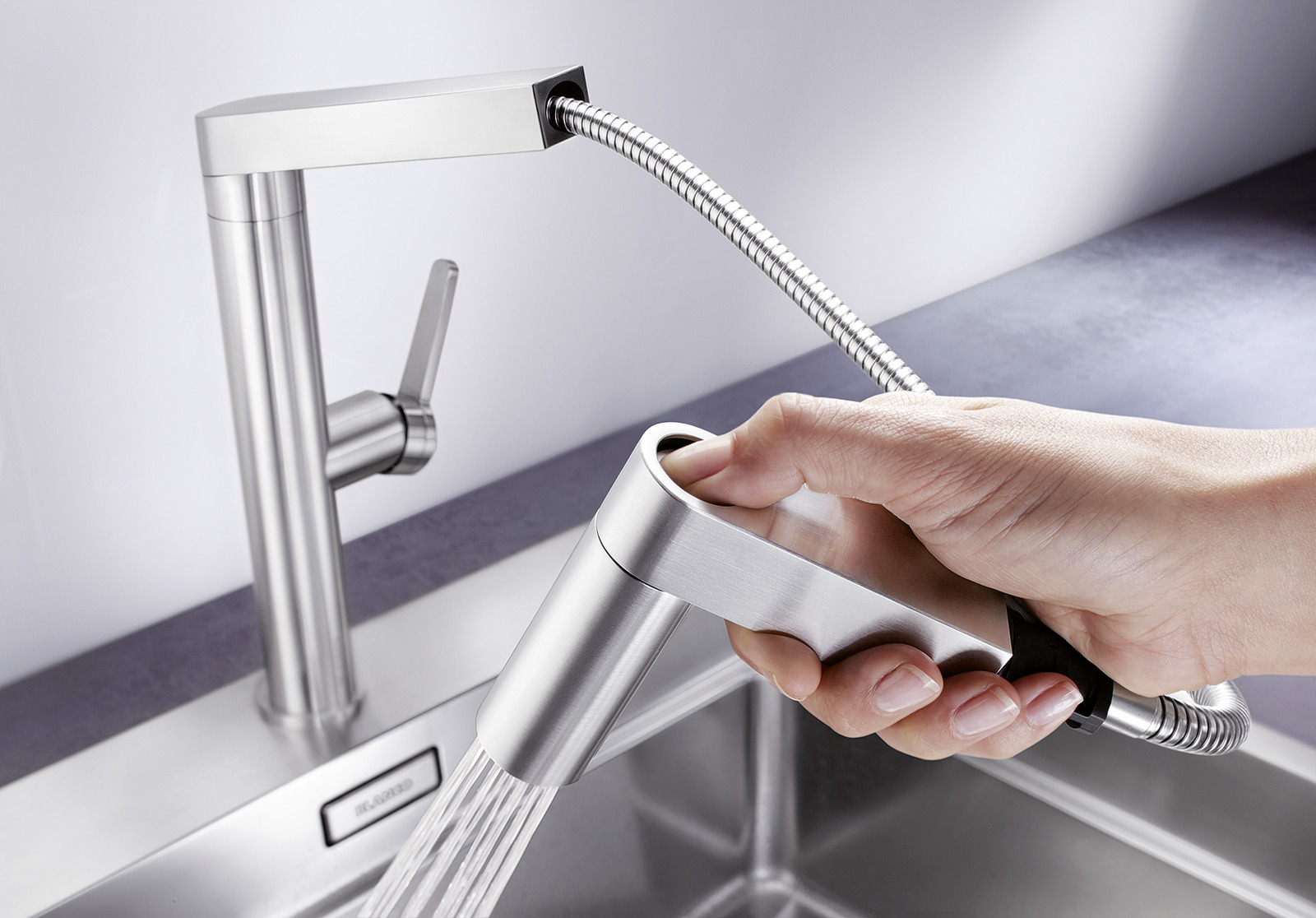 A megoldás pedig a tudatos vásárlás: megfelelő mélységű Blanco silgránit mosogató, jól megválasztott Blanco mosogatócsap, kontrollált víznyomás, adott esetben pedig egy zuhanyfunkciós csaptelep, amely még jobban kézben tarthatóvá teszi a vízsugarat.