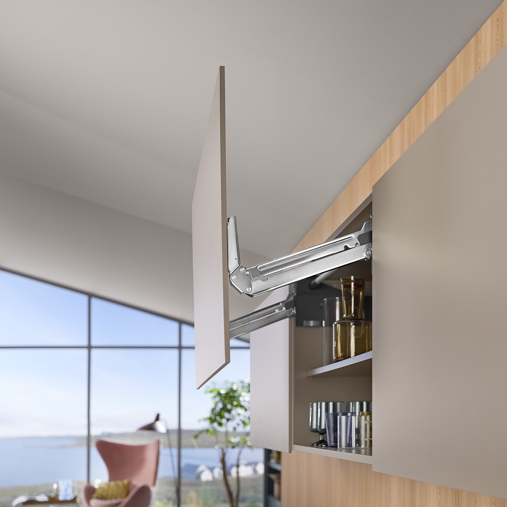 Häfele Free család: A Häfele mérnökei a „könnyedségre” fókuszáltak. A Free flap és Free fold rendszerek rendkívül kompakt kialakításúak, így kevesebb helyet foglalnak el a szekrény belsejéből, miközben még a legnehezebb frontokat is pontosan a kívánt magasságban állítják meg.