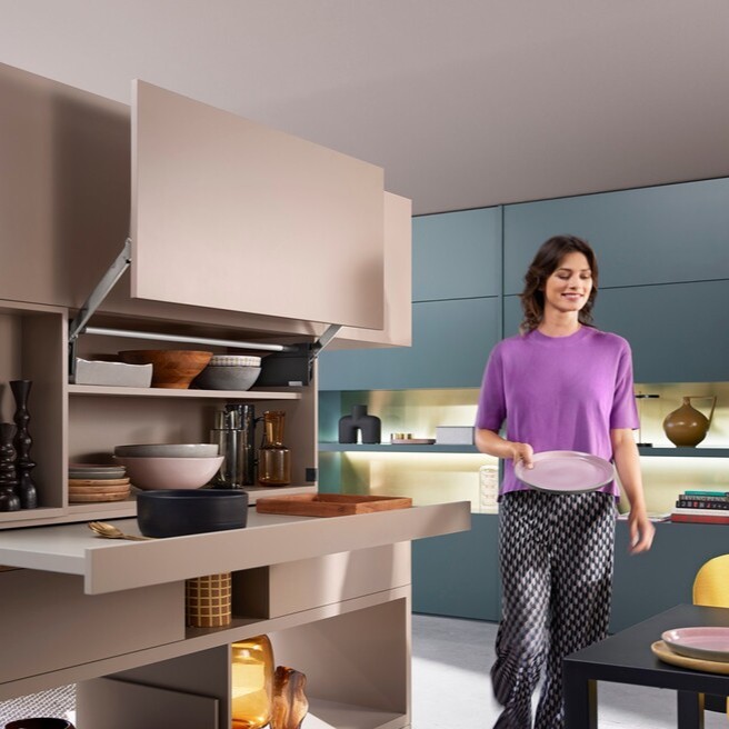 A felnyíló vasalatok igazi ereje a precíziós megállíthatóságban és a selymes mozgásban rejlik. A prémium liftes mechanikák lehetővé teszik, hogy a frontot bármely ponton megállítsa, így az mindig kényelmesen elérhető marad a visszazáráshoz. A beépített csillapítás és a választható elektromos rásegítés (Servo-Drive) révén a nehéz, nagyméretű ajtók is súlytalanul, egyetlen ujjnyomással nyithatók és csukhatók. Legyen szó harmonika-szerűen összecsukódó, párhuzamosan emelkedő vagy ívesen felnyíló megoldásokról, a technológia célja az, hogy a felső szekrények tartalma akadálytalanul, mégis elegáns módon váljon hozzáférhetővé. Ezek a rendszerek nemcsak a kényelmet fokozzák, hanem a konyha vizuális megjelenését is tisztábbá és modernebbé teszik, hiszen lehetővé teszik a szélesebb, összefüggő frontok használatát is.