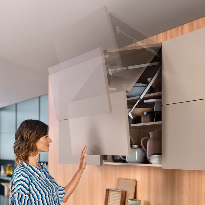 Blum AVENTOS HF (Harmonika): A magas és közepes felső szekrények ideális megoldása, ahol a kétrészes front nyitáskor középen összecsukódik. Így az ajtó nem nyúlik be mélyen a térbe, a fogantyú pedig bármely pozícióban könnyen elérhető marad.
